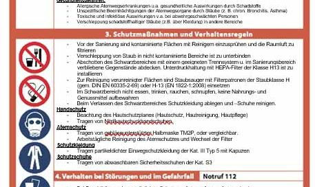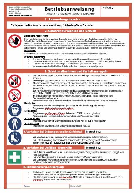 Wir kümmern uns um Gefahren… Bei Wasserschäden kann es leicht zur Kontamination von Bauteilen oder Inventar kommen. Das kann Schimmelpilzbelastung, Schutzwasser oder sogar eine Belastung von Schadstoffen sein. Nur wenige wissen, dass in diesem Fall Betriebsanweisungen, als Hinweis für Gebäudenutzer,