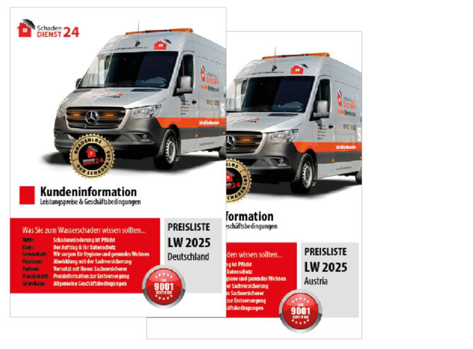 Preisstabil – Leistungsverzeichnis 2025 Das neue Leistungsverzeichnis, als Preisliste zur Erstversorgung von Wasserschäden, für 2025 überrascht mit nahezu gleich günstigen Kosten, wie 2024. Die gute Nachfrage sorgte dafür, dass Pauschalen kaum erhöht werden mussten und auch der Stundenlohn für Leistungen